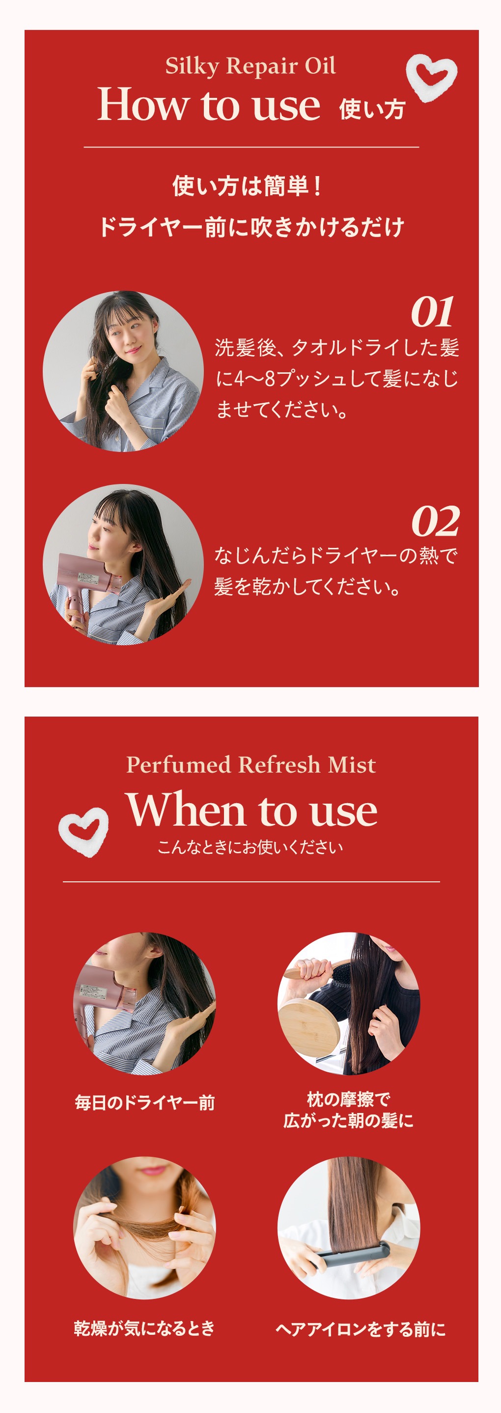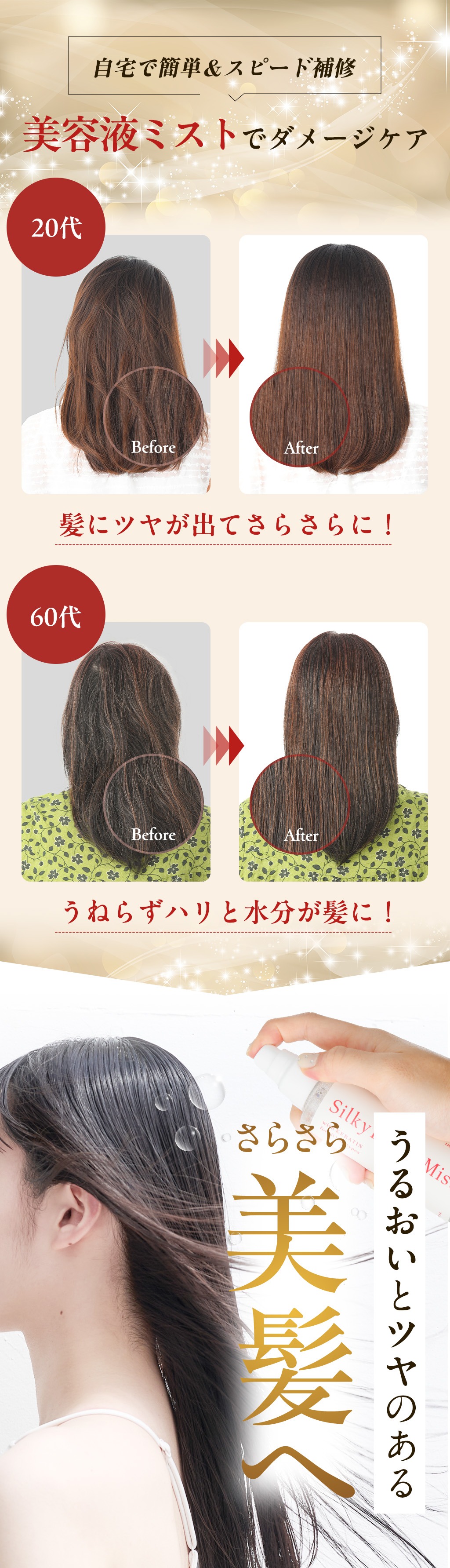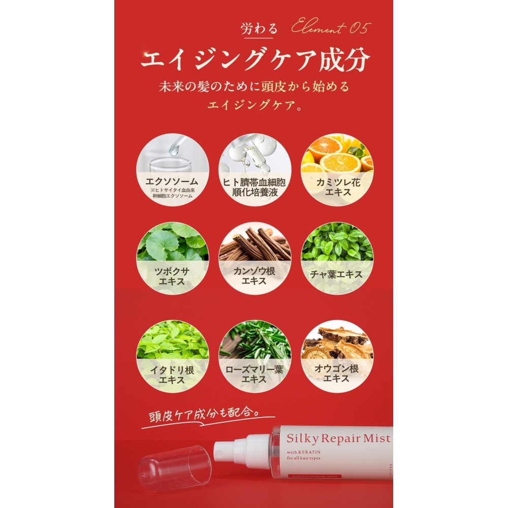 Silky Repair Mistは、毎日のスタイリング前やドライヤー前にシュッとひと吹きするだけ。髪の芯まで潤いを補給し、サロン帰りのような指通りなめらかな美髪へと導きます。