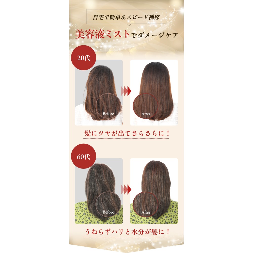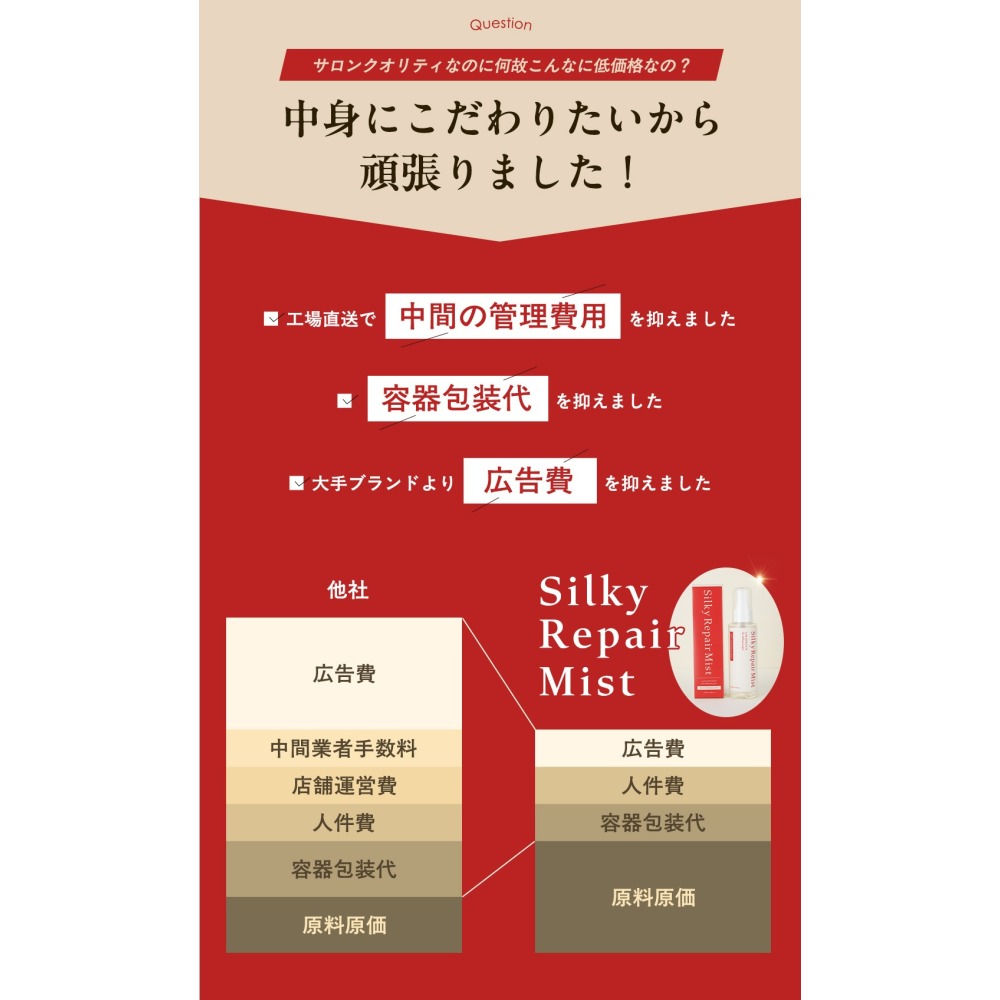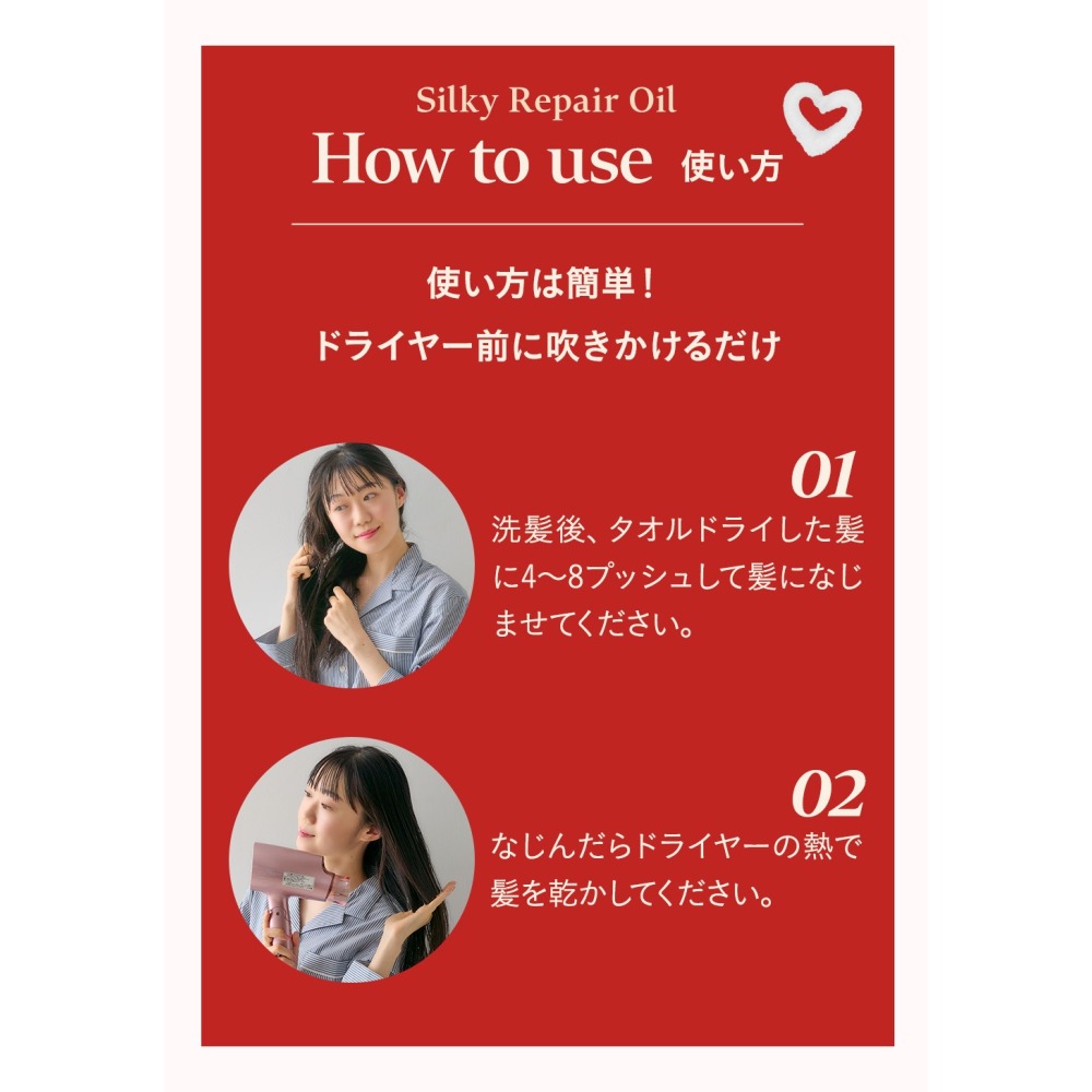 Silky Repair Mistは、毎日のスタイリング前やドライヤー前にシュッとひと吹きするだけ。髪の芯まで潤いを補給し、サロン帰りのような指通りなめらかな美髪へと導きます。
