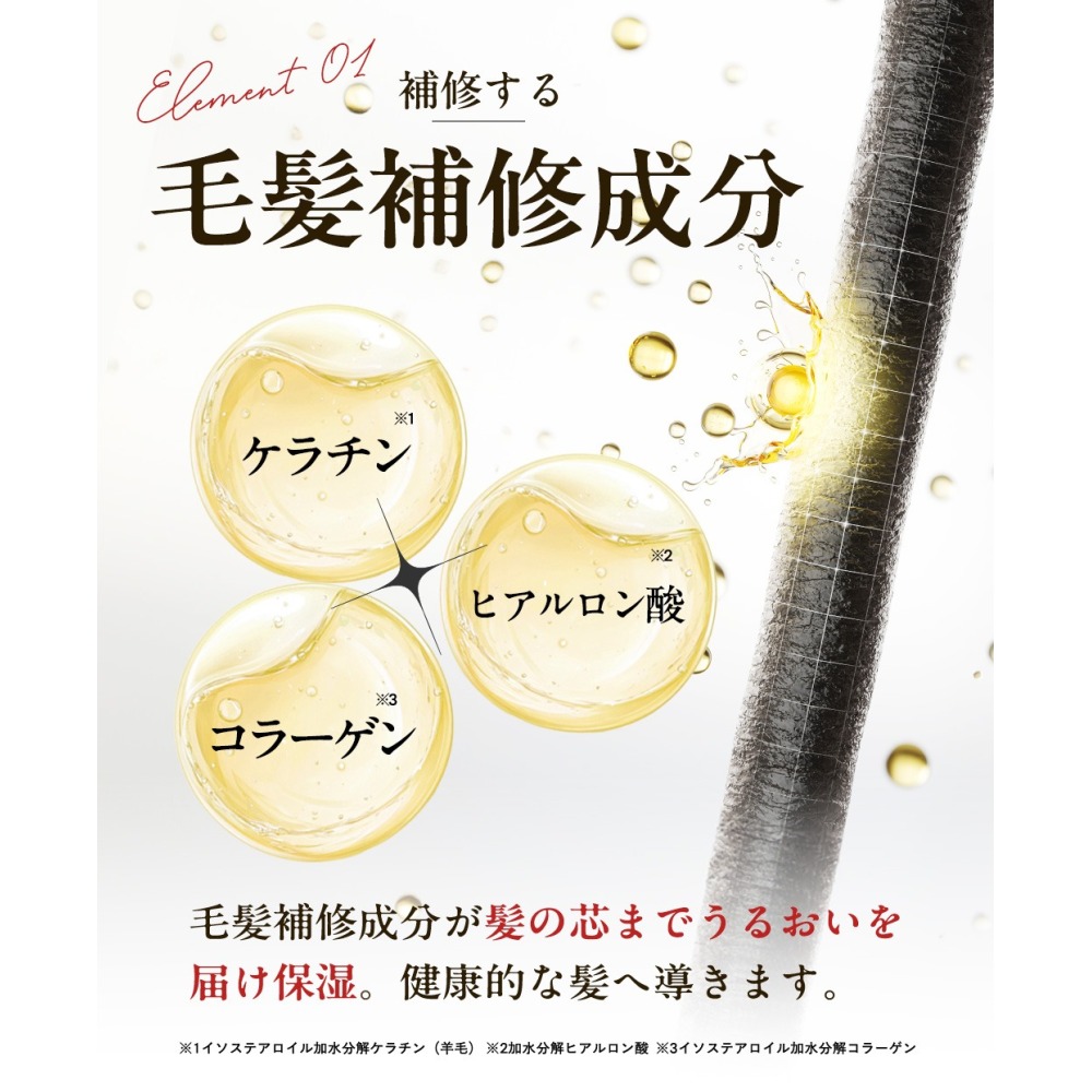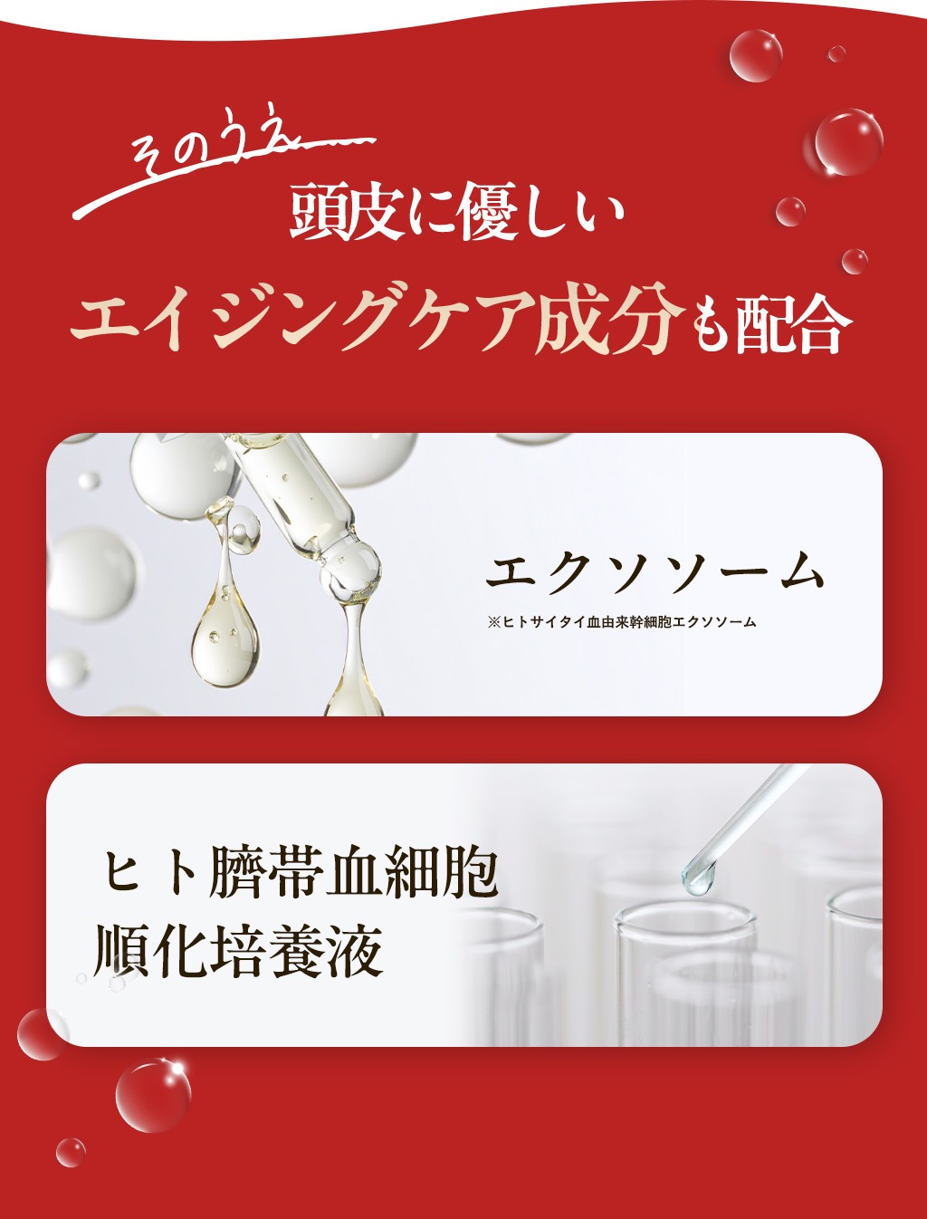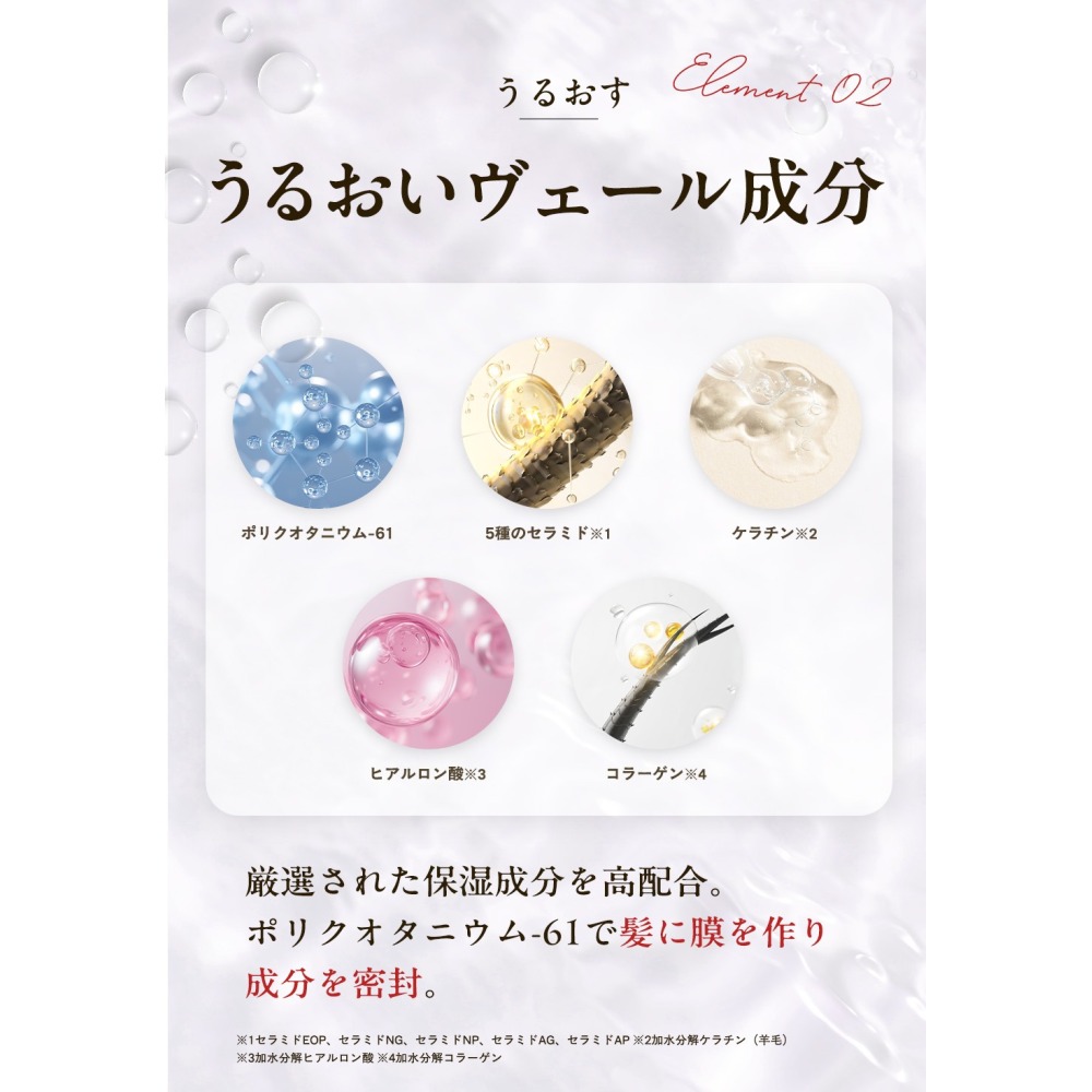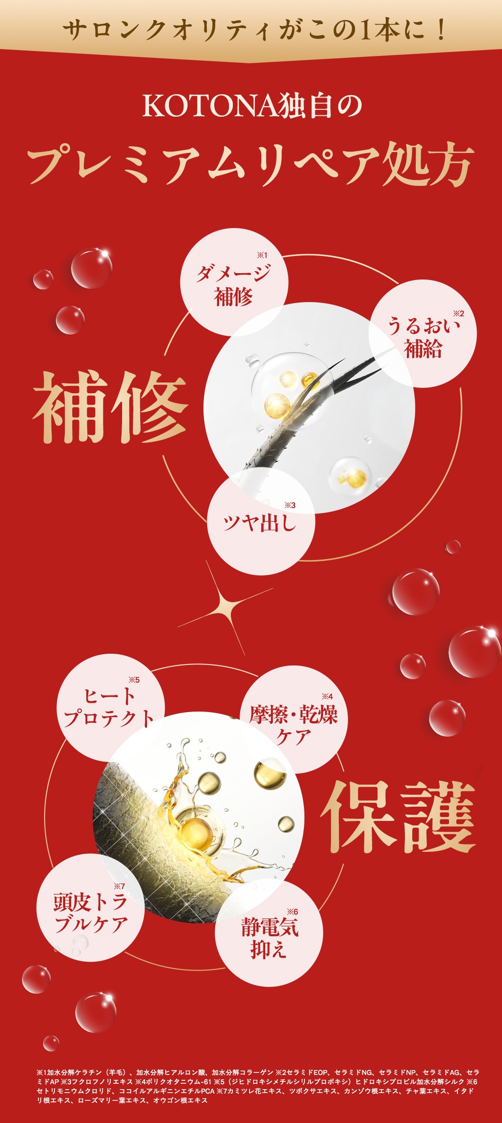 ダメージを補うケラチン※1、潤いをチャージするヒアルロン酸&コラーゲン※2、髪を守るポリクオタニウム-61※3、さらに注目のエイジングケア成分※4(ヒト臍帯血細胞順化培養液・エクソソーム)まで配合。 ダメージ補修から保護、エイジングケアまで7つの働きをこの1本に凝縮しました。