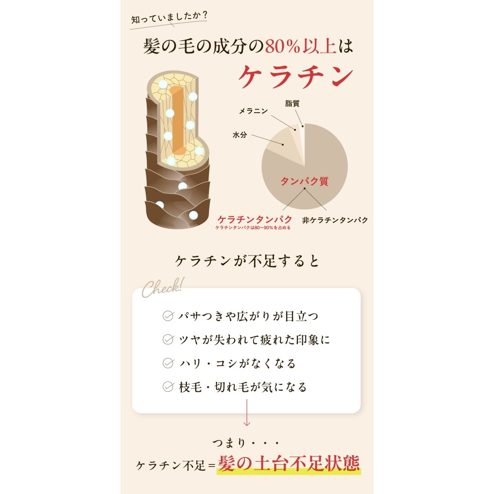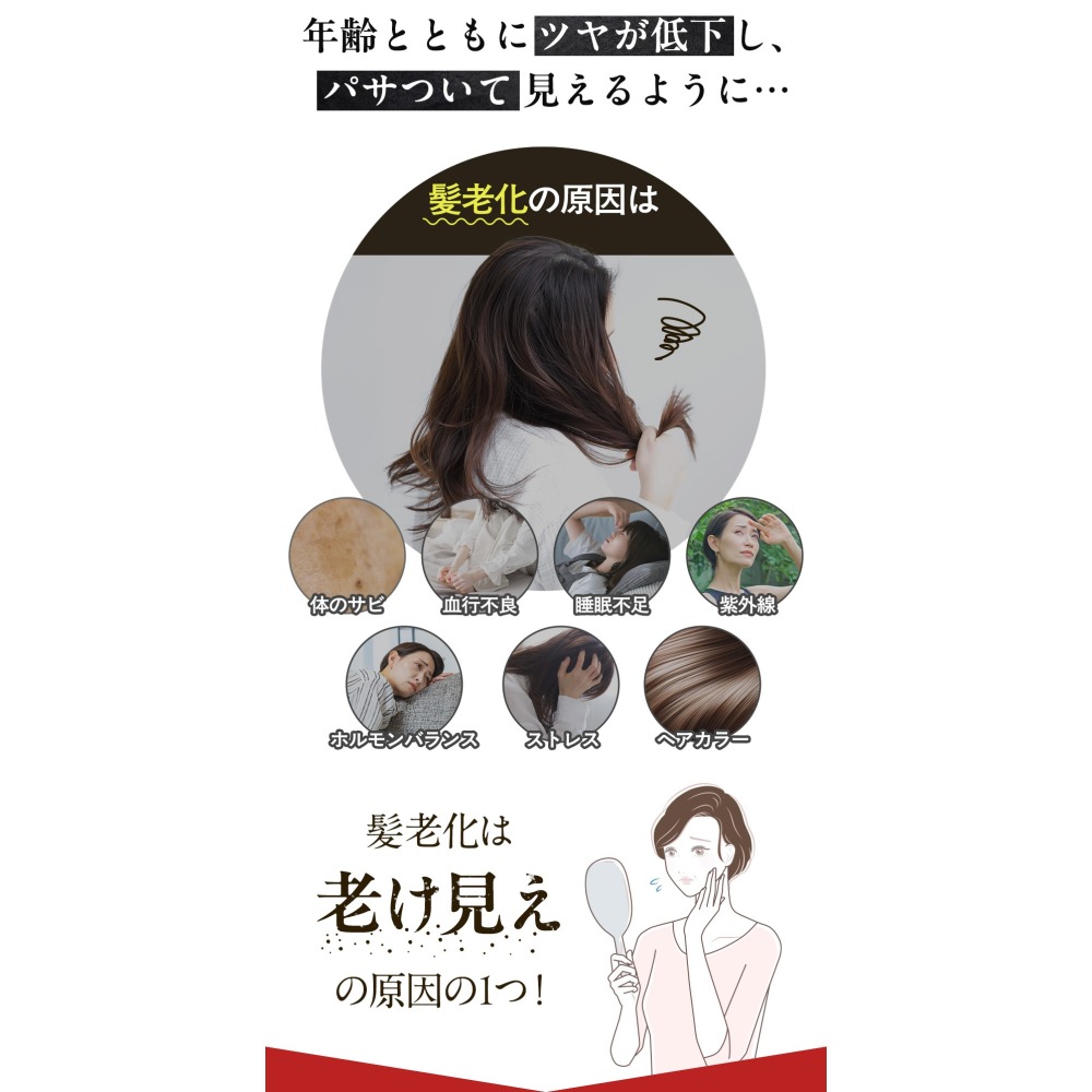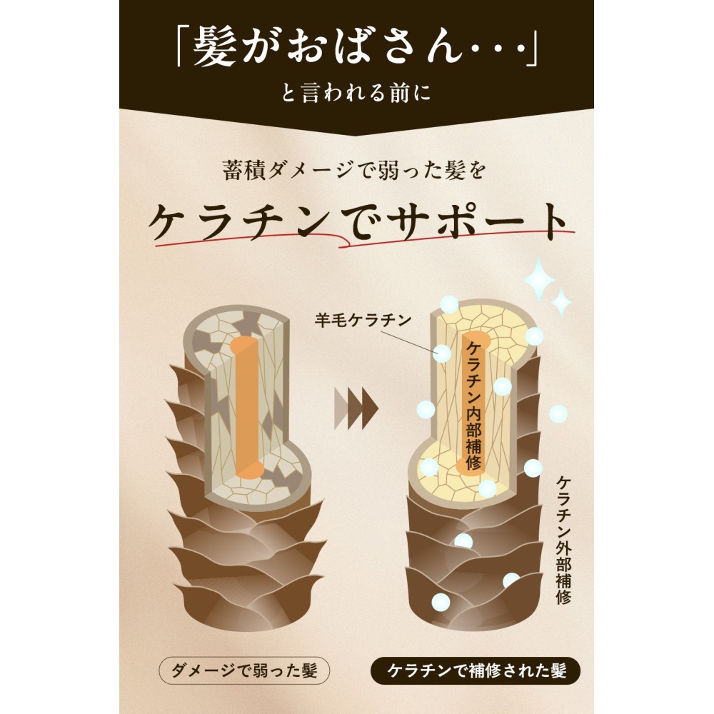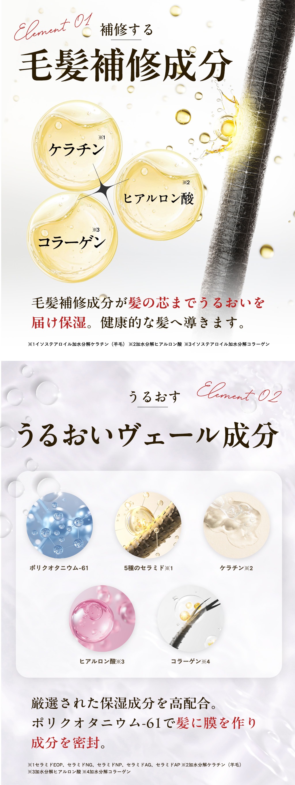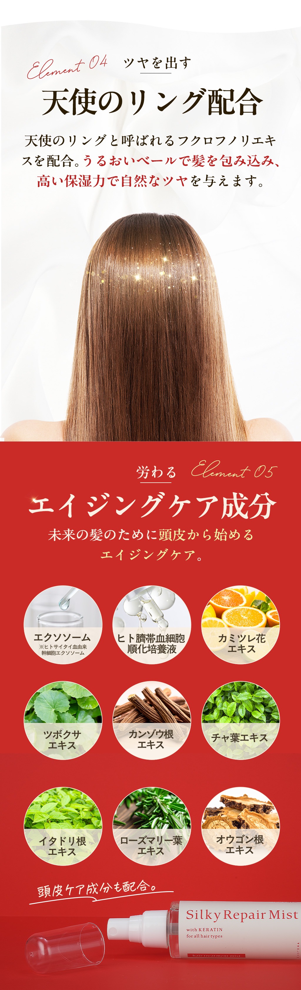 ダメージを補うケラチン※1、潤いをチャージするヒアルロン酸&コラーゲン※2、髪を守るポリクオタニウム-61※3、さらに注目のエイジングケア成分※4(ヒト臍帯血細胞順化培養液・エクソソーム)まで配合。 ダメージ補修から保護、エイジングケアまで7つの働きをこの1本に凝縮しました。