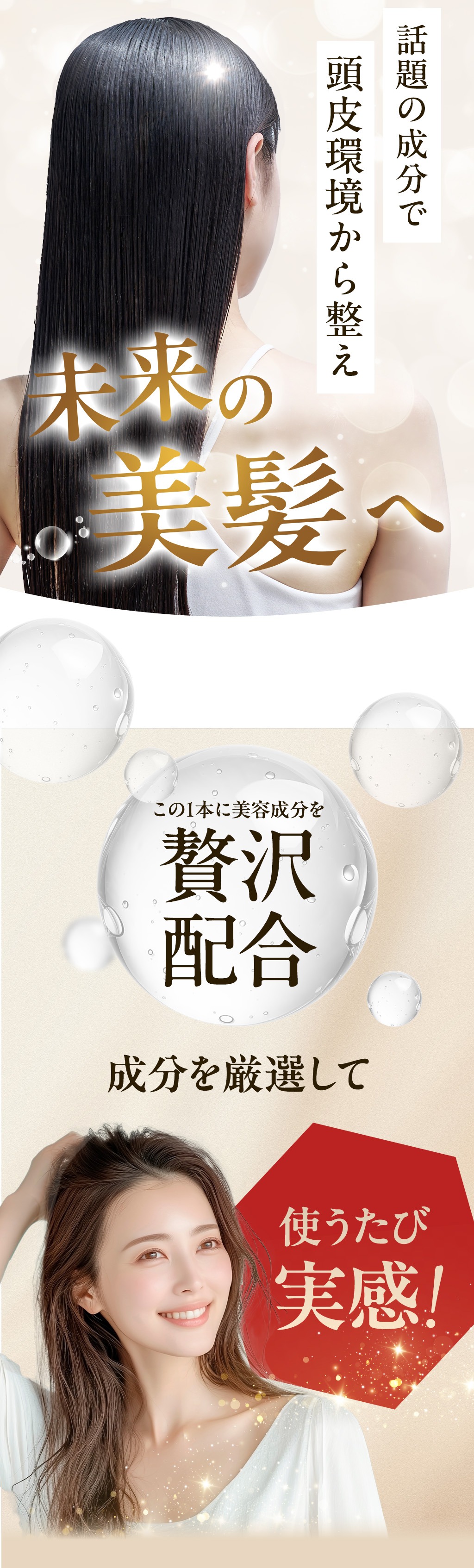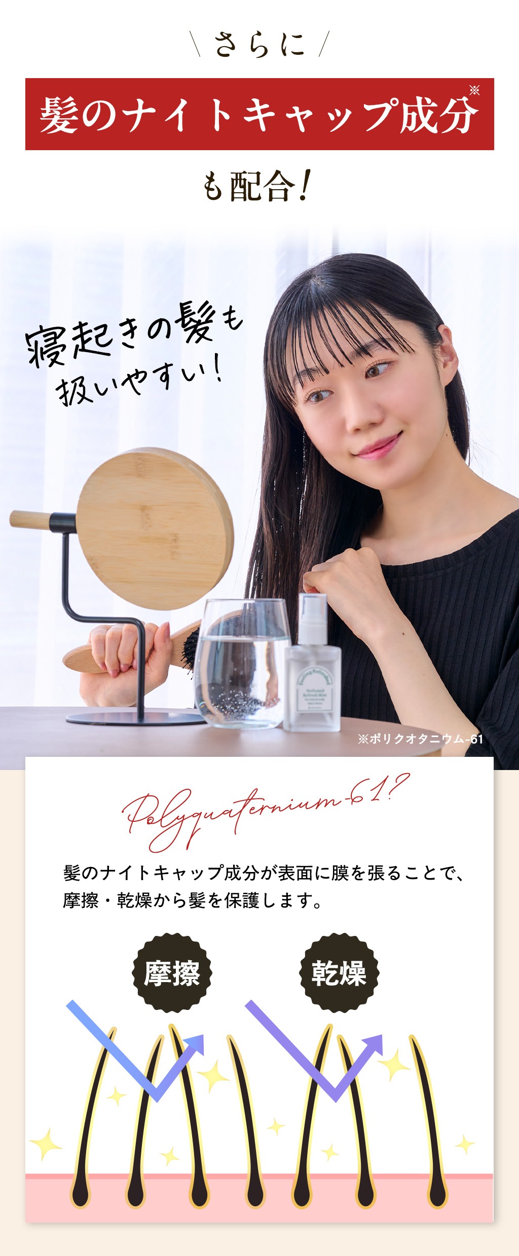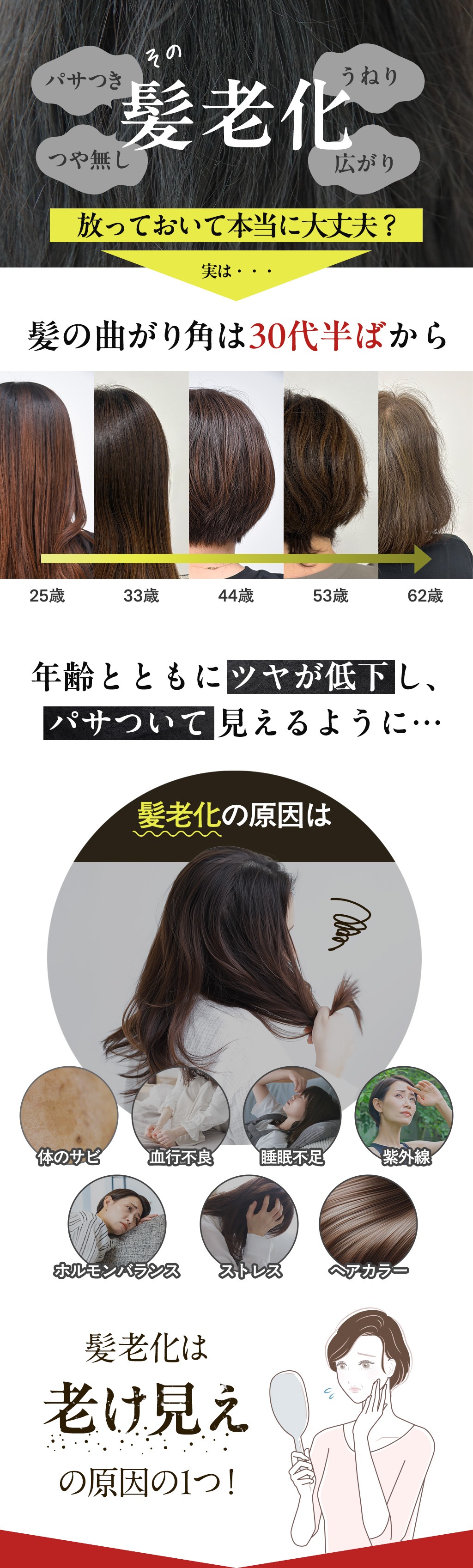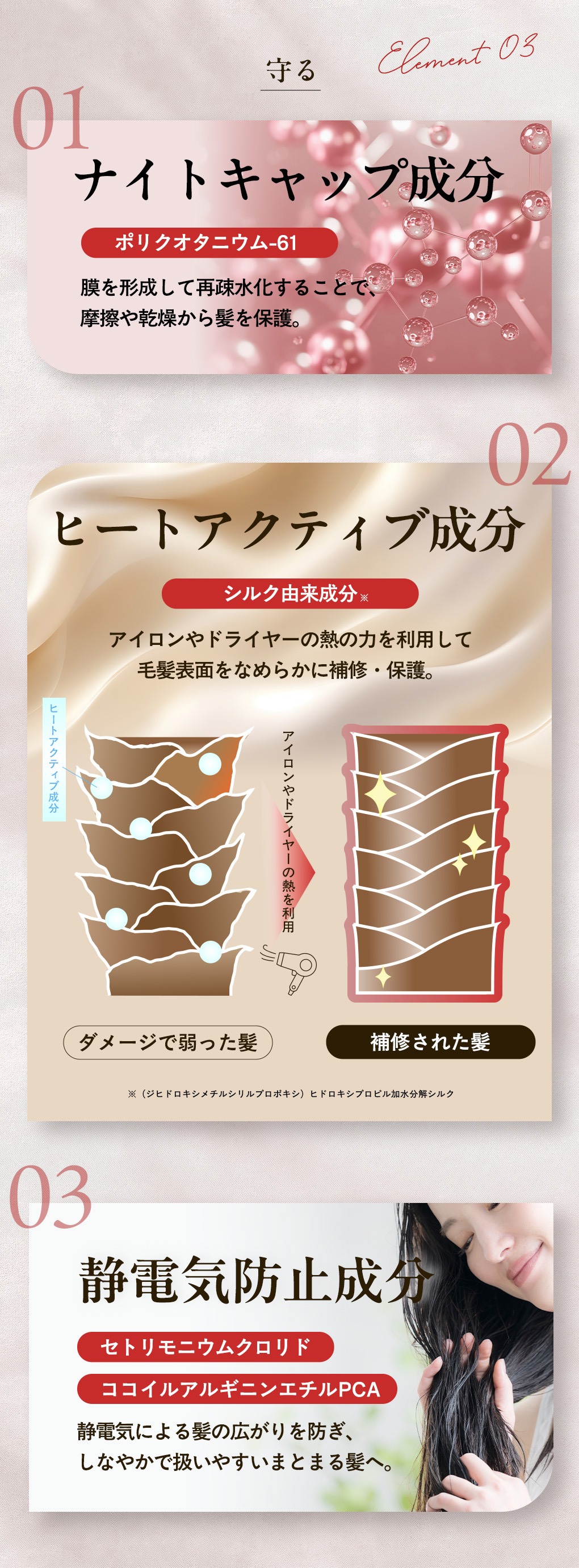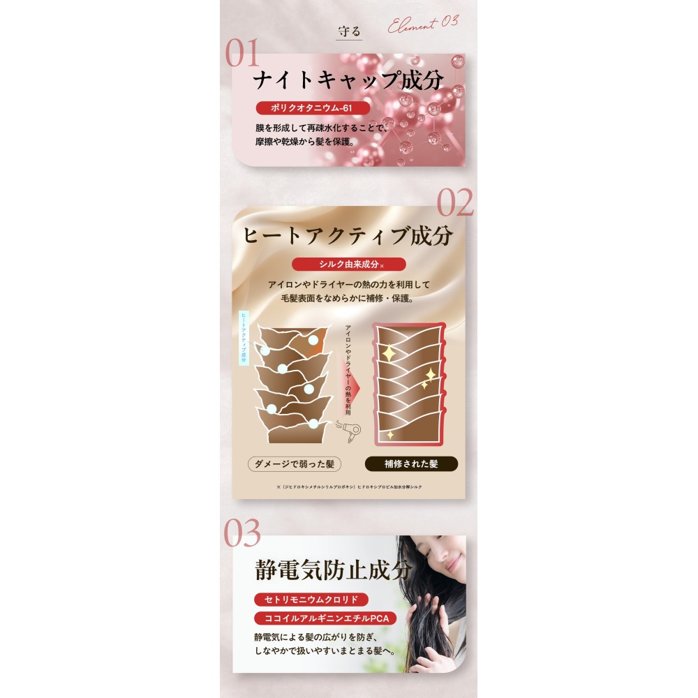 寝起きの扱いにくい髪も、まるでナイトキャップをしたかのようにしっとりまとまりやすく。 毎日のケアで、長年のダメージや年齢によるクセ髪も、ツヤのあるさらさら髪へ。